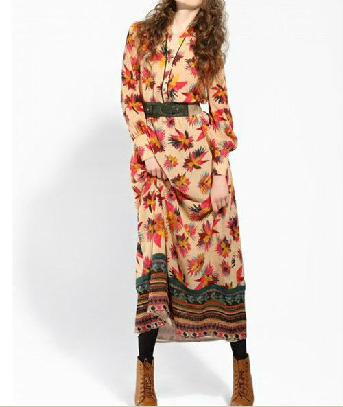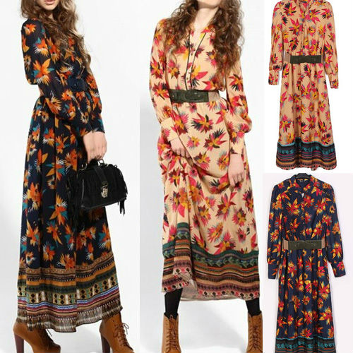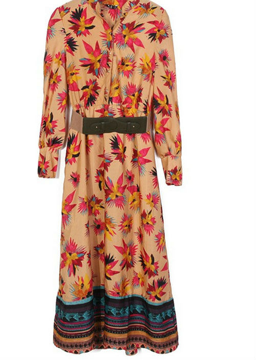 Bohemian style long dress with cuff stand-up collar and elastic waist.