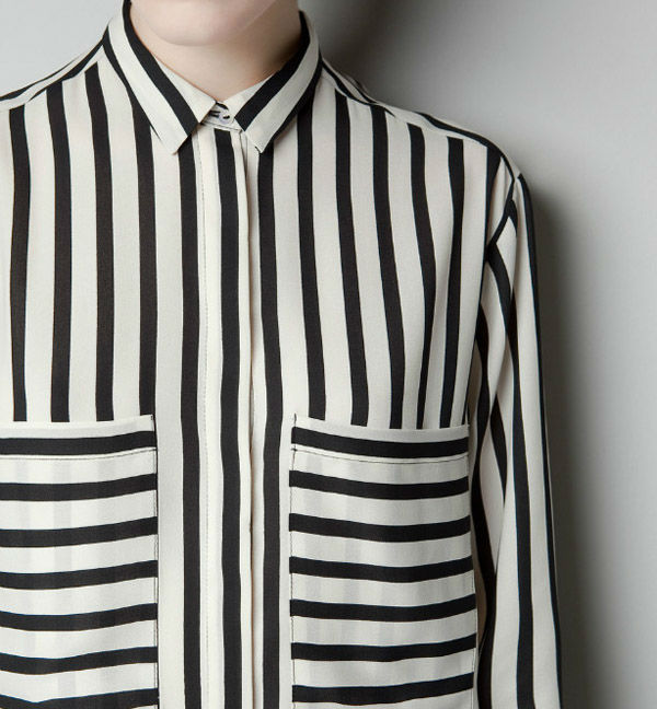 Loose asymmetrical black and white vertically striped chiffon blouse with pockets.
