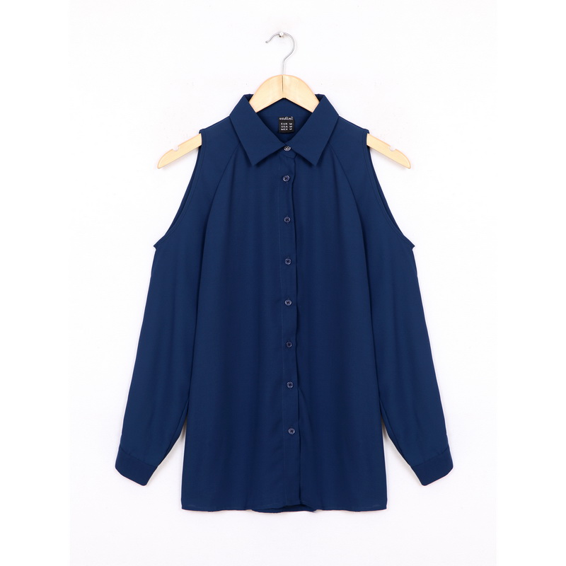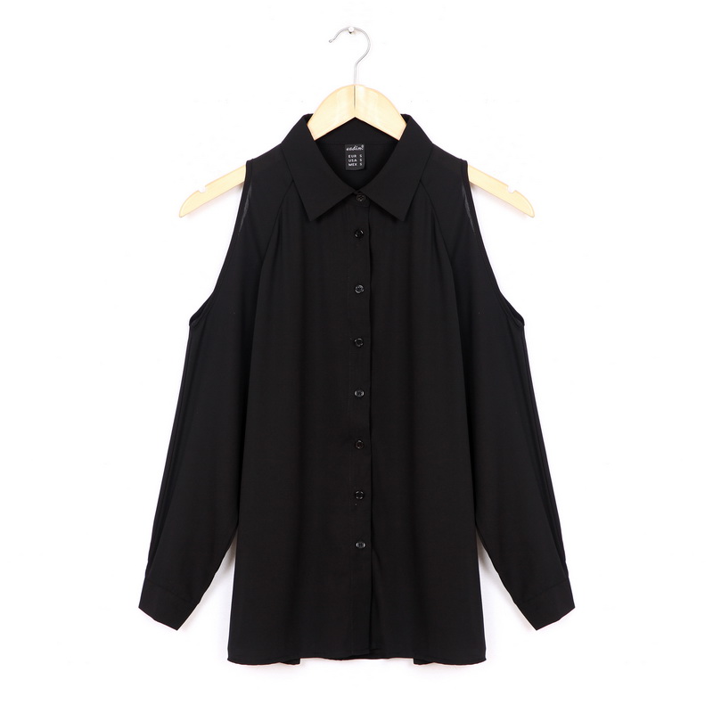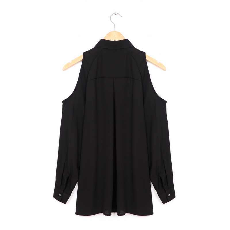 Sexy long sleeve cold shoulder chiffon blouse with turn down collar available in 4 colors.