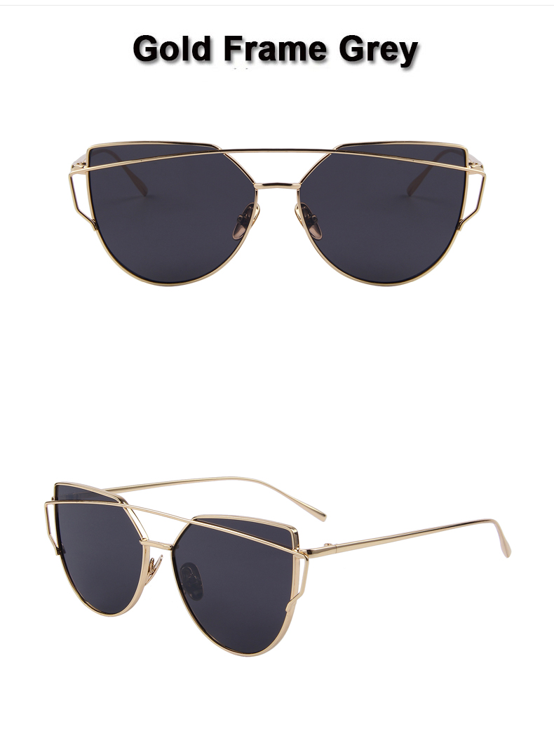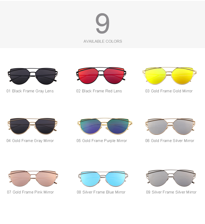 Hot Selling Mirror Flat Lense Women's Cat Eye Sunglasses With Metal Frame In 9 Assorted Colors.